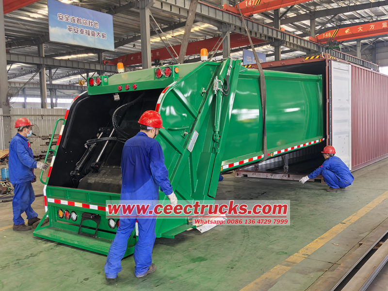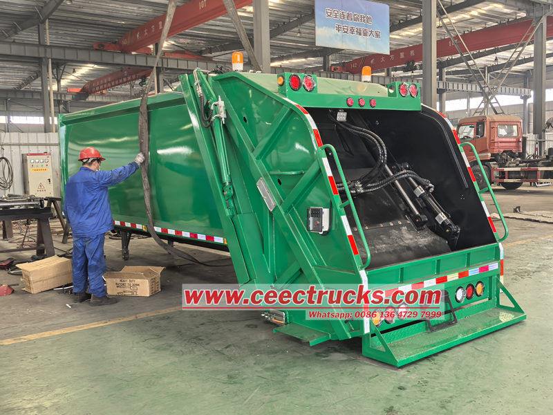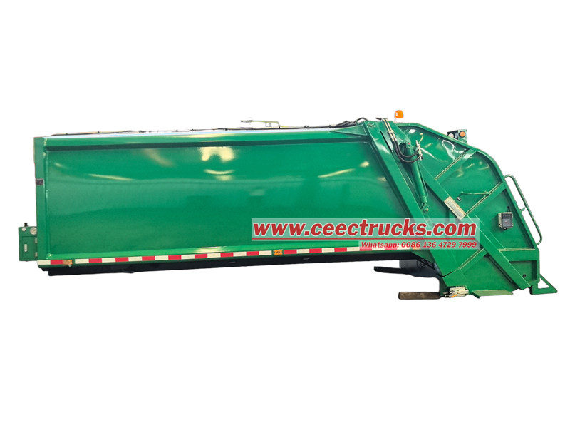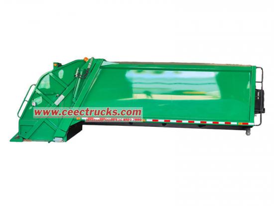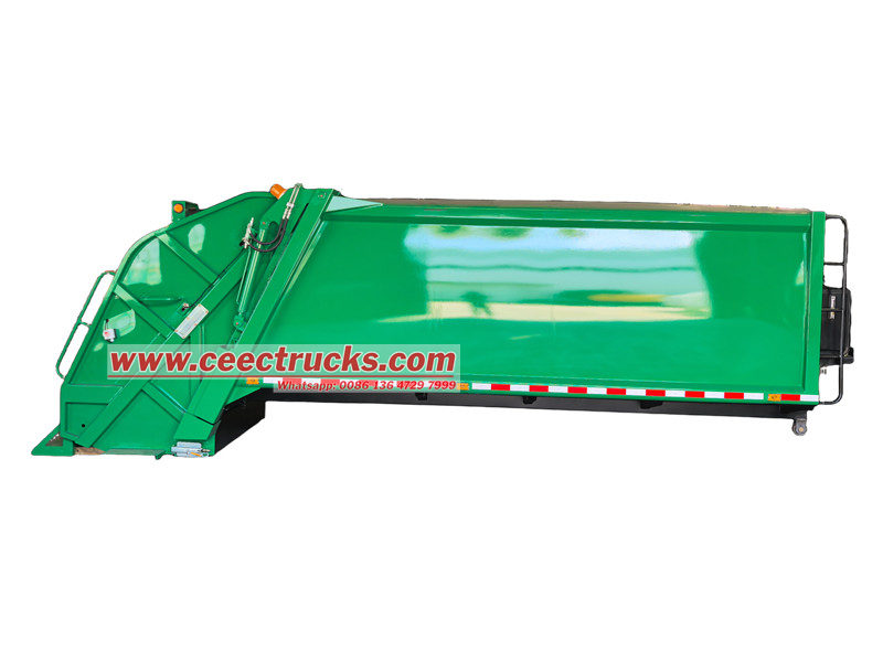 12 текше метр қоқыс жинайтын машинаның корпусының құрылымы берік және берік құрылым үшін тұтас бүйірлік панельдері мен дөңгелек пішіні бар жоғары берік болат тақталардан дәнекерленген. Интерьер тот басудың алдын алу үшін арнайы өңделген және жоғары тиімді қысу механизмімен жабдықталған, қалдықтар көлемін айтарлықтай азайтады және жүк тиеу қабілетін арттырады. Тығыз тығыздау қалдықтардың ағуын және иістерді болдырмайды. Үстіңгі корпус - үш тиеу және түсіру режимі бар 12 текше метр қорап.