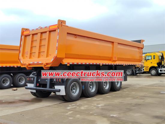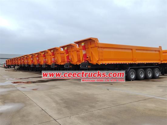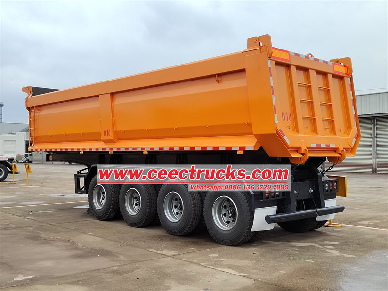 4 осьті жартылай тіркеме тиімді тасымалдау үшін арнайы әзірленген, 13 тонналық FUWA осьтерімен және HYVA гидравликалық цилиндрлерімен жабдықталған, жүк көтергіштігі 50 тонна. Өлшемдері 12000 мм x 2500 мм x 3200 мм және өзіндік салмағы 12 тонна, ол тұрақты жүргізуді қамтамасыз ету үшін қос тізбекті пневматикалық тежеу жүйесі мен болат пластиналы серіппелі суспензияға ие. Тау-кен өнеркәсібі, құрылыс, жол құрылысы және ауыл шаруашылығын қоса алғанда, әртүрлі сценарийлер үшін қолайлы, бұл тасымалдау тиімділігін арттыру және шығындарды азайту үшін тамаша таңдау болып табылады.