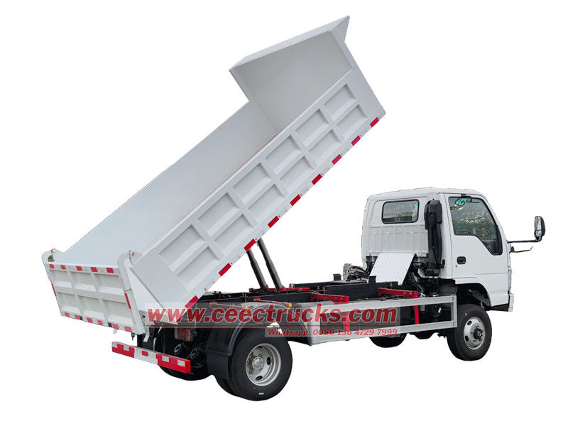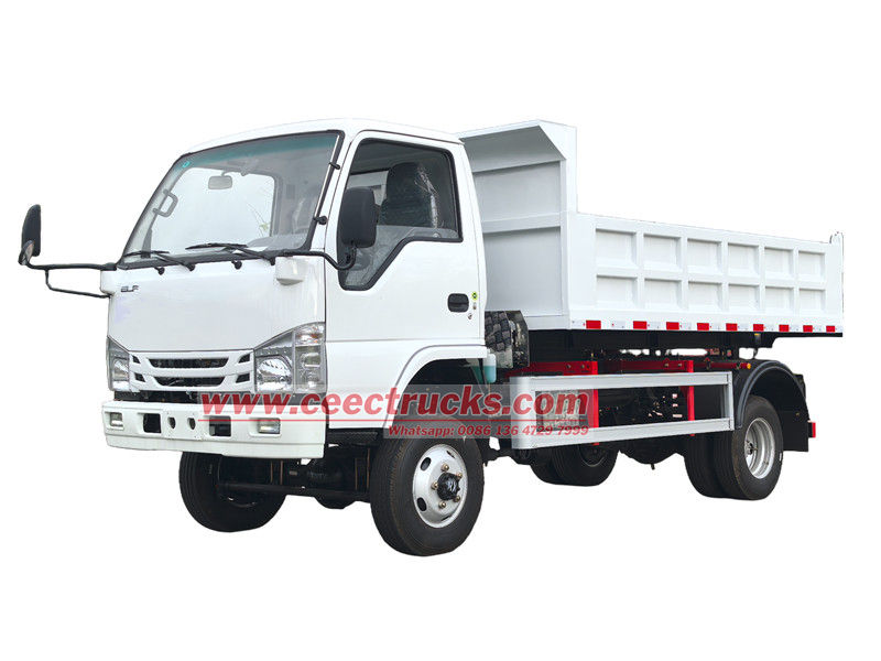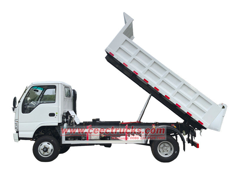 Isuzu 2ton шағын самосвал Isuzu ELF NKR шассиі негізінде модификацияланған, доңғалақ базасы 3360 мм, Isuzu 120HP 4KH1CN6LB дизельдік қозғалтқышымен, Isuzu MSB-5 жылдамдықты беріліс қорабымен және көміртекті болаттан жасалған самосвалмен жабдықталған, астыңғы жағы 4мм, бүйірі 3×50.50 мм. орталық көтеру, тұрақты көтеру, таза және жылдам түсіру, артқы есіктерді ашуға болады, ал көлік жүргізуші жағындағы басқару клапанымен басқарылады, оны басқару оңай.