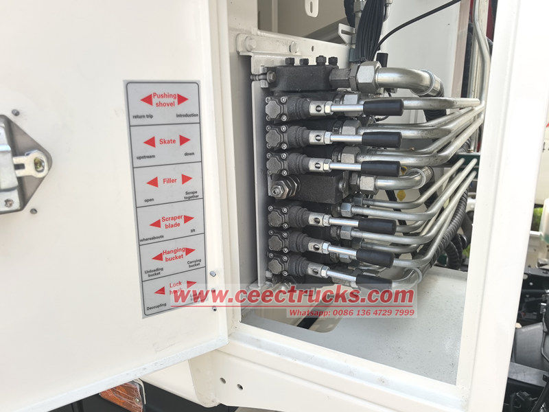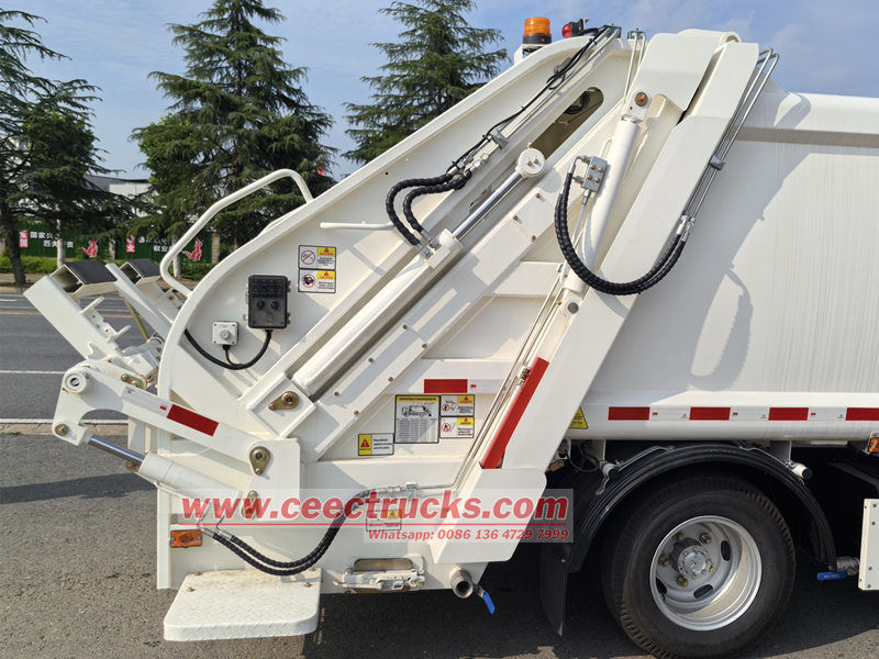 ● Жүкті түсіру кезінде көтеру цилиндрі жүктегіштің артқы есігін бағыттаушы саңылау бойымен оның құлпын ашу үшін көтереді, ал итергіш пластина қоқысты шығару үшін артқа жылжиды. Бүкіл процесс тиімділік пен қауіпсіздікті қамтамасыз ету үшін электронды басқару жүйесінің бір түймесі арқылы басқарылады.