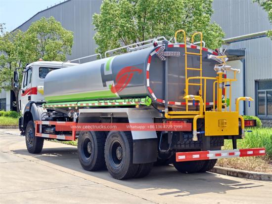 Сонымен су цистернасы негізделген Beiben 6x6 толық жетекті шасси, барлық доңғалақтары қозғаушы күшпен қамтамасыз етеді, сырғанау мен батып кетуден сақтай отырып, төмен ұстайтын беттерде (балшық, қар, құм және мұз) тартымдылық пен өрмелеу қабілетін айтарлықтай жақсартады. Beiben жол талғамайтын шассиі әдетте жоғары жерді тазартуды ұсынады, бұл оларға өрескел жолдардағы кедергілерді (мысалы, үлкен тастар, терең ойықтар және құлаған ағаштар) оңай өтуге мүмкіндік береді, шасси мен төменгі резервуардың түбіне түсу қаупін азайтады және қорғайды. Көбінесе көп жапырақты серіппелі немесе гидропневматикалық суспензия қолданылады, бұл жүк көтергіштігінің жоғарылауын және керемет соққыға төзімділігін қамтамасыз етеді, олар асфальтталмаған жолдардың қатты соққыларына төтеп беруге және көлік құрылымы мен цистерна жабдықтарын қорғауға мүмкіндік береді. Үлкен жақындау/кету бұрыштары алдыңғы және артқы бамперлердің соқтығысуына жол бермей, тік беткейлерде және тұйық жолдармен көтерілуд