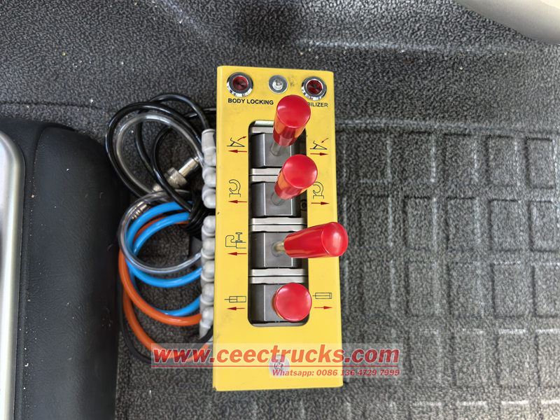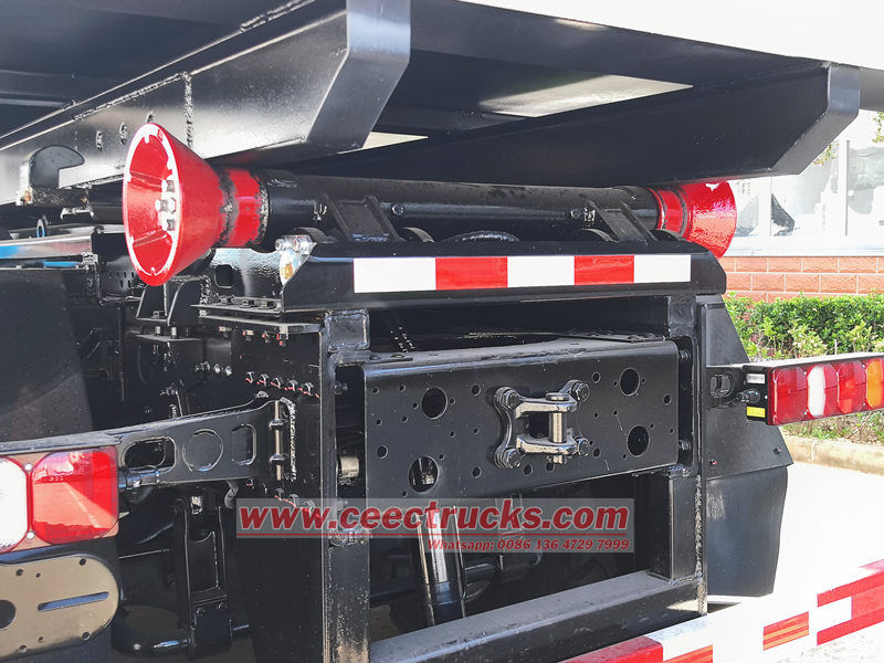 Жүк көлігі 11 12.00R20 шиналарымен жабдықталған, бұл жүк көтергіштігін және әртүрлі жол жағдайларына бейімделуді қамтамасыз етеді. Жүк машинасының артқы жағында гидравликалық ілгегі бар жеке корпус пен шасси бар, бұл қоқыс жәшіктерін жылдам тиеуге, түсіруге және тасымалдауға мүмкіндік береді.