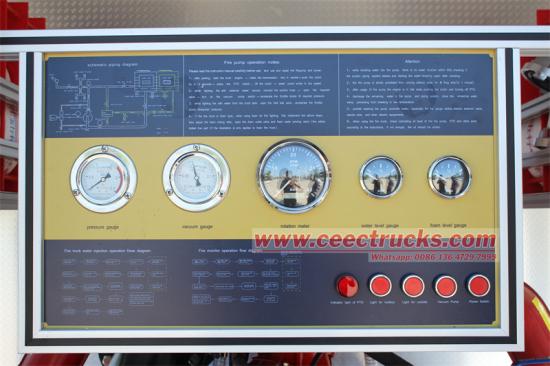 ●Басқару тақтасы:кіріктірілген тахометр (қозғалтқыштың айналу жылдамдығын бақылайды), вакуум өлшегіш (сорғы вакуумын анықтайды), манометр (судың қысымын нақты уақыт режимінде көрсетеді), көбік деңгейінің көрсеткіші (көбік сұйықтығының қалған мөлшерін көрсетеді), су деңгейінің көрсеткіші (су ыдысындағы су деңгейін көрсетеді).