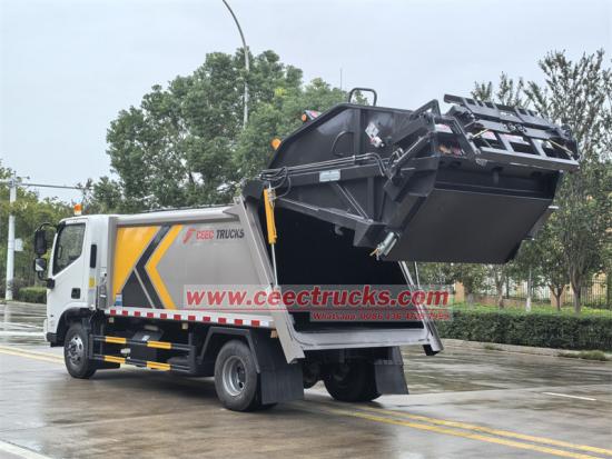 Foton қоқыс сығымдағыш машинасы артқы еңкейткіш құрылғымен жабдықталған, жұмыс істеуге арналған қос гидравликалық цилиндрлері бар тапсырыс бойынша модель. Халықаралық стандартты контейнерлерді, қосымша материалды пластик пен металды көтеру үшін қолайлы. Қосымша өлшем 120L, 240L, 360L, 660L, 770L, 1100L, т.б.