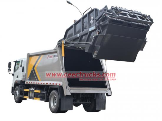 Foton қоқыс сығымдағыш машинасы артқы еңкейткіш құрылғымен жабдықталған, жұмыс істеуге арналған қос гидравликалық цилиндрлері бар тапсырыс бойынша модель. Халықаралық стандартты контейнерлерді, қосымша материалды пластик пен металды көтеру үшін қолайлы. Қосымша өлшем 120L, 240L, 360L, 660L, 770L, 1100L, т.б.
