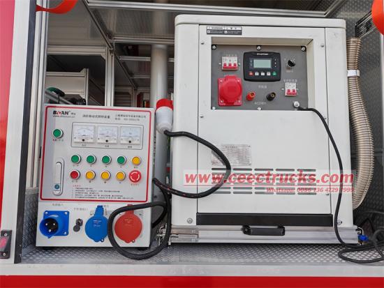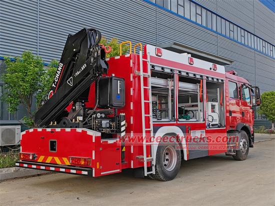 HOWO TX350 4х2 жиналмалы кранымен өрт сөндіру көлігі, ол howo TX350 4x2 өрт сөндіру көлігі шассиі негізінде модификацияланған, 2+4 орындық, 4600 мм доңғалақ базасы, SINOTRUK MC07H.35-60 қозғалтқышы, 350HP, Euro6OT. беріліс қорабы, көлік құралының алдыңғы қорабы өртке қарсы жылжымалы жарықтандыру құрылғысымен жабдықталған, ол өрт сөндіру машинасының жоғарғы жағындағы көтеру-түсіру шамдарын басқаруға және генератордың кернеуі мен ток жиілігін бақылауға арналған. Оның қуатқа қол жеткізу/шығару интерфейсі, қолмен басқару интерфейсі, авариялық тежегіш, синхронды генератор жинағы, SmartGen генератор жинағы контроллері, үш фазалы ажыратқыш қосқышы, бір фазалы автоматты ажыратқыш шамы, ZFDQ02 автоматты ажырату зарядтау және үрлеу құрылғысы және T-CHENG SQ5ZA2 5 тонналық 5 тонналық T-CHENG SQ5ZA2 жиналмалы тұтқасы, көлік құралының оң жақ бұрандалары, жұмыс істейтін бұрғылау крандары бар. т.б.