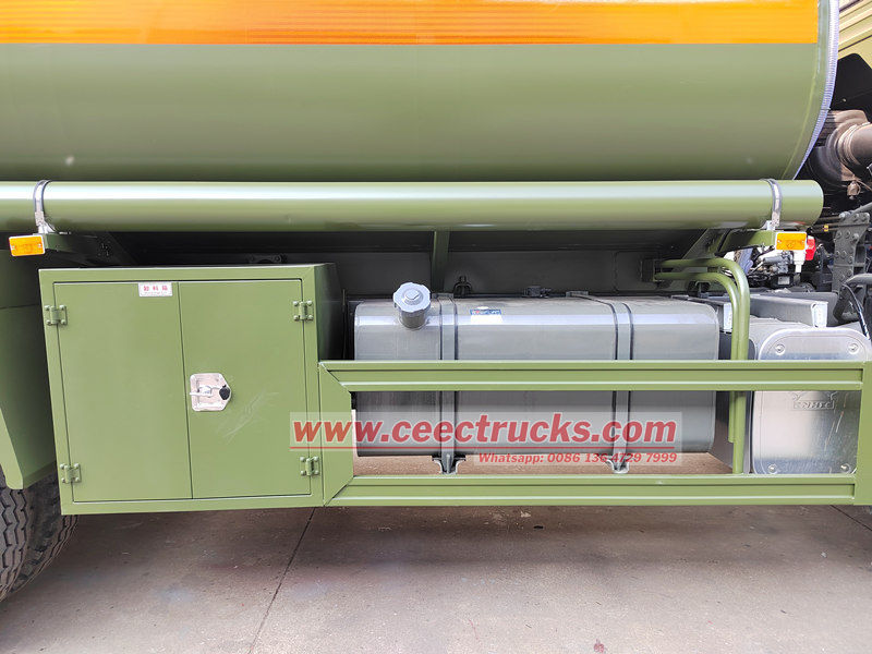 HOWO 6x6 әскери жылжымалы отын диспенсері HOWO 6x6 шассиіне негізделген, 400 ат күші WP12.400E22 дизельдік қозғалтқышымен және 12.00R20 шинасымен және ZF8118 рульдік берілісімен жабдықталған HW19710 беріліс қорабымен жабдықталған, ол қуатты және басқаруға оңай. Құрылыс алаңы болсын, шалғайдағы жол, әуежай немесе шахта болсын, жанармай құю машинасы икемді түрде жетіп, жабдықты уақытында жанармай құйып, өндіріс пен өмірдің қалыпты жұмысын қамтамасыз ете алады.
