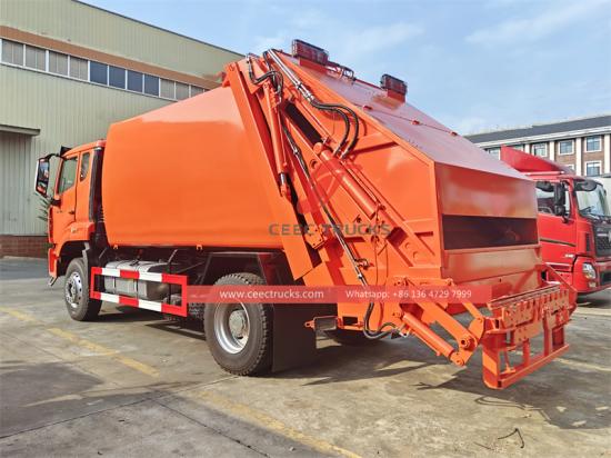 Howo қоқыс жинағыш машинасы Fast 10 алға және 2 кері берілістерді пайдаланады. Мықты жақтаумен және икемді рульмен біріктірілген ол күрделі жол жағдайында тұрақты және тиімді жұмысты қамтамасыз етеді. 15 CBM Қалыңдығы 4 мм Q235 арнайы болаттан жасалған қисық резервуар бір бөліктен тұратын қалыптау процесін пайдаланады, нәтижесінде сығымдау қатынасы 1:3,4 болады, бұл қоқысты нығыздаудың жоғары тиімділігін қамтамасыз етеді. Оның толық автоматты гидравликалық басқару жүйесі тиеу және түсіру циклдерін 40-45 секундқа дейін қысқартады. PLC интеллектуалды басқару жүйесімен жабдықталған ол оңай және жылдам жұмыс істейді. Қолмен басқару режимінде оператор қоқыс бөлігін қысу, түсіру және басқа операцияларды аяқтау үшін жұмыс тұтқасы мен электр басқару түймелерін пайдалана алады.