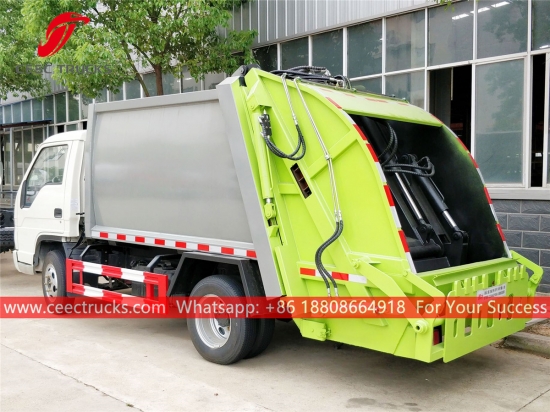 ISUZU 4m3 артқы қоқыс жинайтын автокөлігі, жүк шассиінде ISUZU 98HP дизельді қозғалтқышы, MSB 5 ауысымды беріліс қорабы қолданылады. Оңай жұмыс істеу үшін PLC басқару қорабы. Барлық кескіндеме және логотиптер тұтынушылардың талаптарына негізделген.