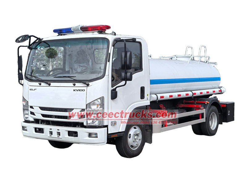 Isuzu KV100 жаңбырлағышы бар сүйретп алынатын су ыдысы ол жаңа Isuzu KV100 шассиінде, 4KH1CN6LB 120HP қозғалтқышында, 4 цилиндрлі 4 тактілі Isuzu MSB 5 жылдамдықты беріліс қорабында модификацияланған, үстіңгі бөлігі 5 куб метр су баспайтын болаттан жасалған сүзгіден жасалған. 40/50 су сорғысы. Кабинаның жоғарғы жағындағы қызыл және көк ескерту шамдары.