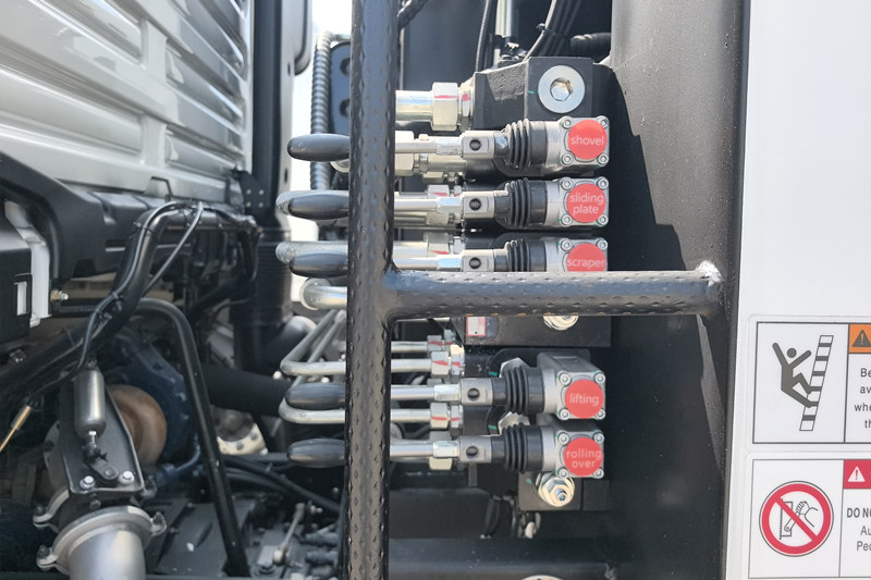 ● Shacman артқы тиегіш нығыздаушы жүк көлігі электрогидравликалық басқару клапандарын және электрондық және гидравликалық басқарудың артықшылықтарын біріктіретін PLC бағдарламаланатын басқару жүйесін пайдаланады. Бұл біріктірілген электрогидравликалық басқару гидравликалық және электрлік жүйелер арасындағы интерфейс мәселелерін тиімді шешеді, жұмыс сенімділігін арттырады.