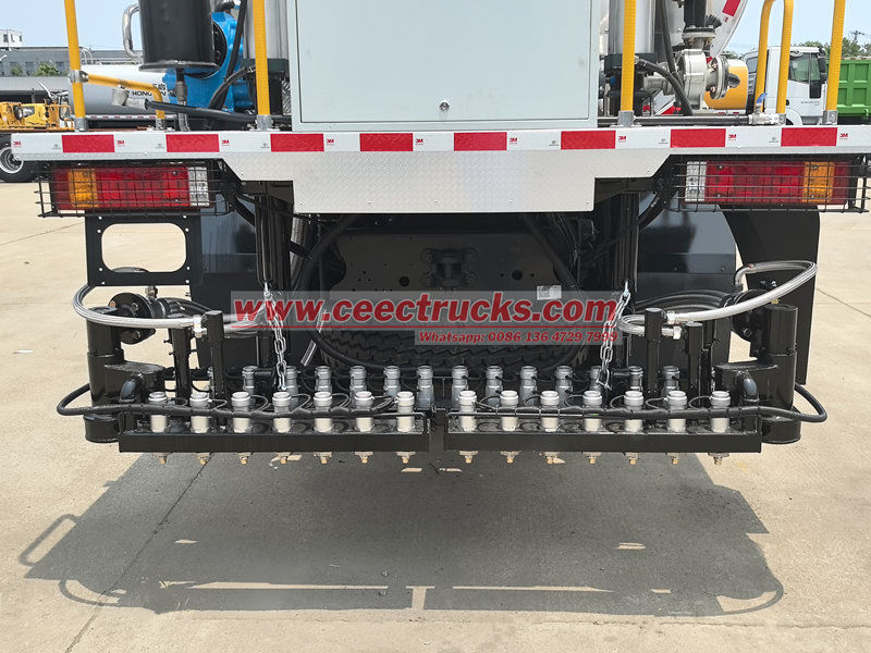 Shacman X3000 битум дистрибьюторының автоцистернасының артқы жағы ені реттелетін тартылатын бүріккіш штангамен жабдықталған, ол жоғары дәлдіктегі ағынды басқару саптамаларының бірнеше жиынтығымен жабдықталған. Ол құрылыс талаптарына (өткізгіш қабат, жабысқақ қабат және тығыздау қабаты сияқты) сәйкес бүрку көлемін және жабуды дәл реттей алады және 0,2-3L/㎡ кең ауқымды айнымалы бүркуге қол жеткізе алады.